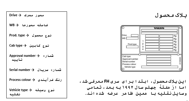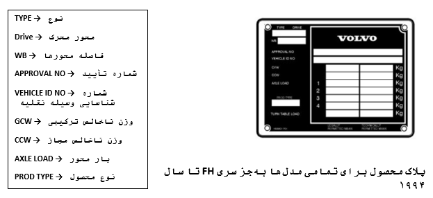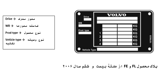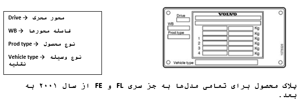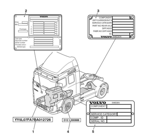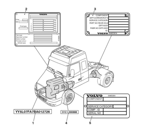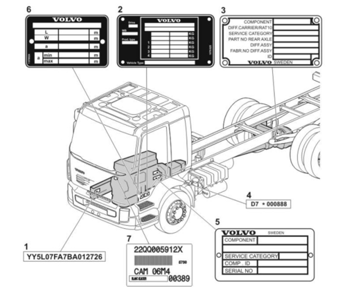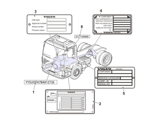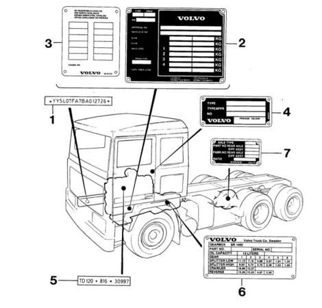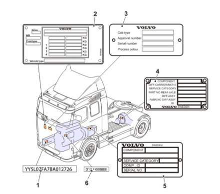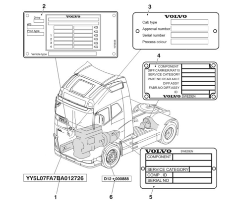 پلاک محصول ولوو، اطلاعاتی در مورد نوع شاسی، محور محرک، فاصله محورها و شماره شناسایی خودرو (VIN) را در بر میگیرد. این اطلاعات توسط خود ولوو روی پلاک حک میشوند.