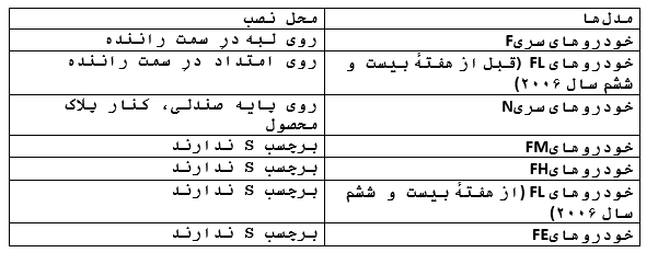 محل قرارگیری برچسبهای شماره ۲ (پلاک محصول ) و شماره ۳ (برچسبS ) بسته به مدل خودرو متفاوت است.