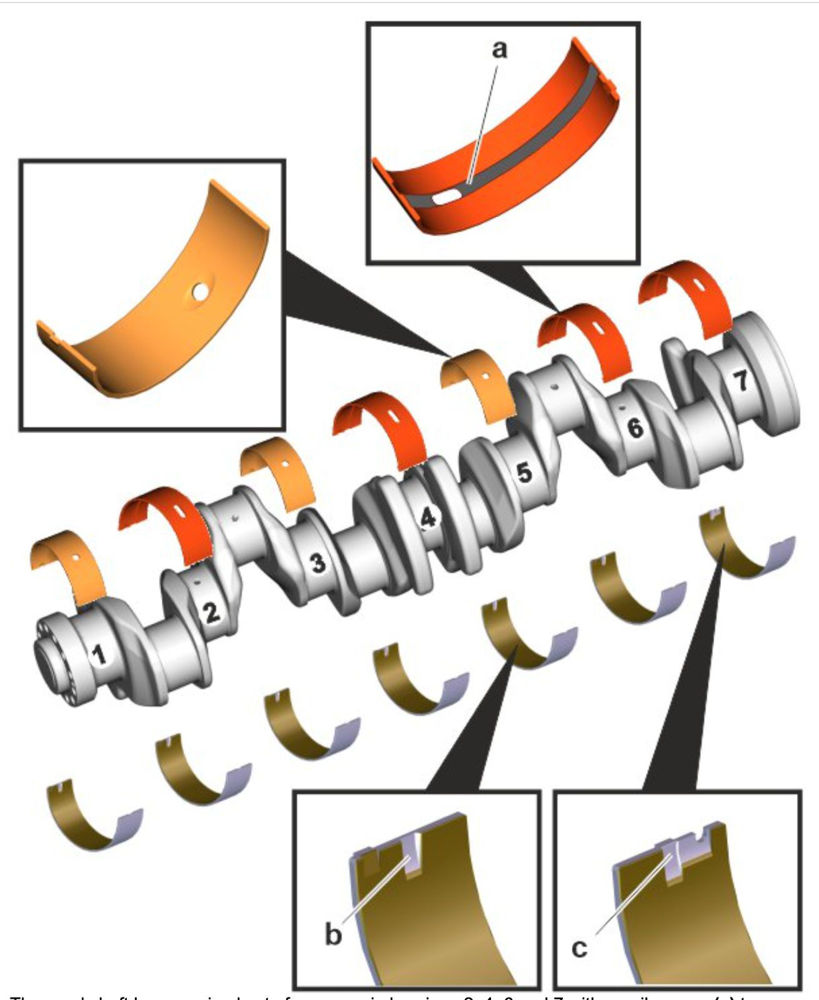 یاتاقانهای بالایی شماره ۲، ۴، ۶ و ۷ دارای شیار روغنکاری جدیدی (a) هستند که باعث جریان بهتر روغن و افزایش فشار روغن در دورهای پایین (Low RPM) میشود.