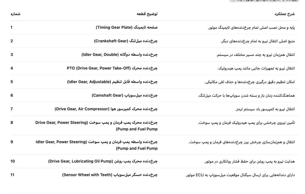 در جدول زیر اجزای اصلی مجموعه چرخدندههای موتور ولوو FH/FM با موتور D13 آورده شده است. هر کدام از این چرخدندهها وظیفه خاصی در هماهنگی و انتقال نیرو از میللنگ به سایر بخشهای موتور دارند 👇