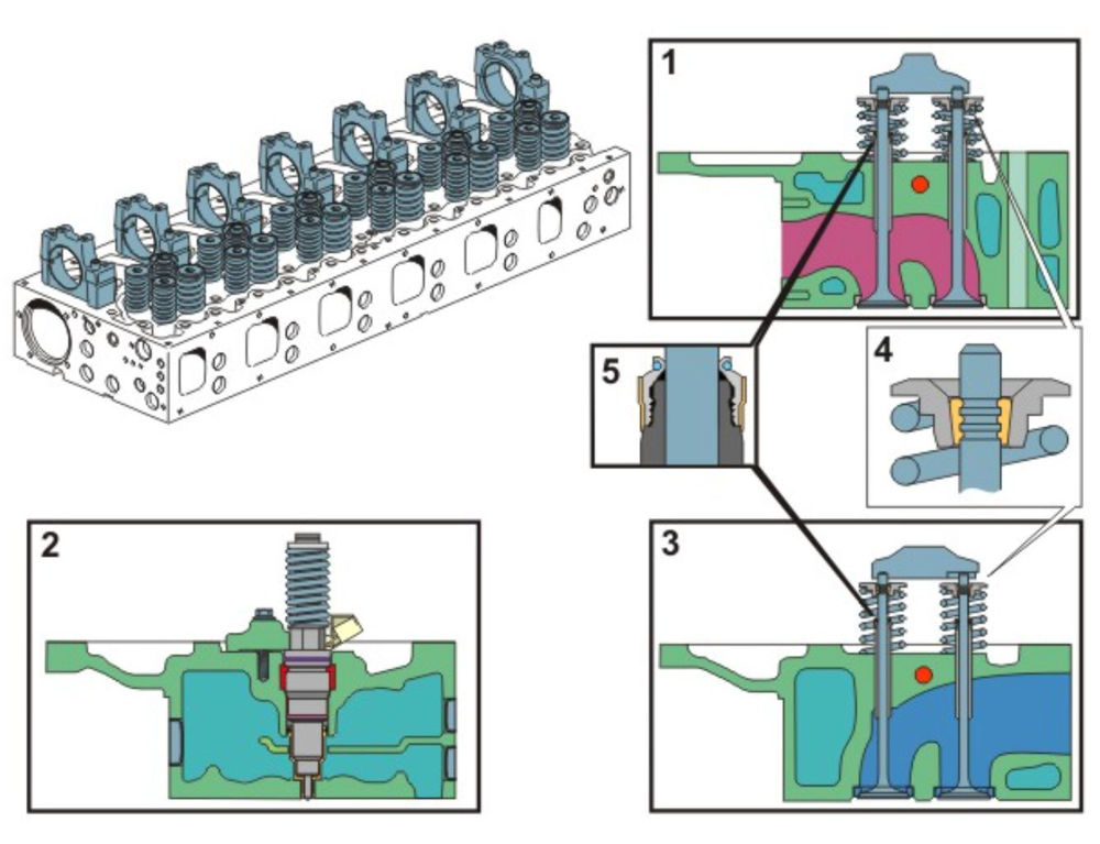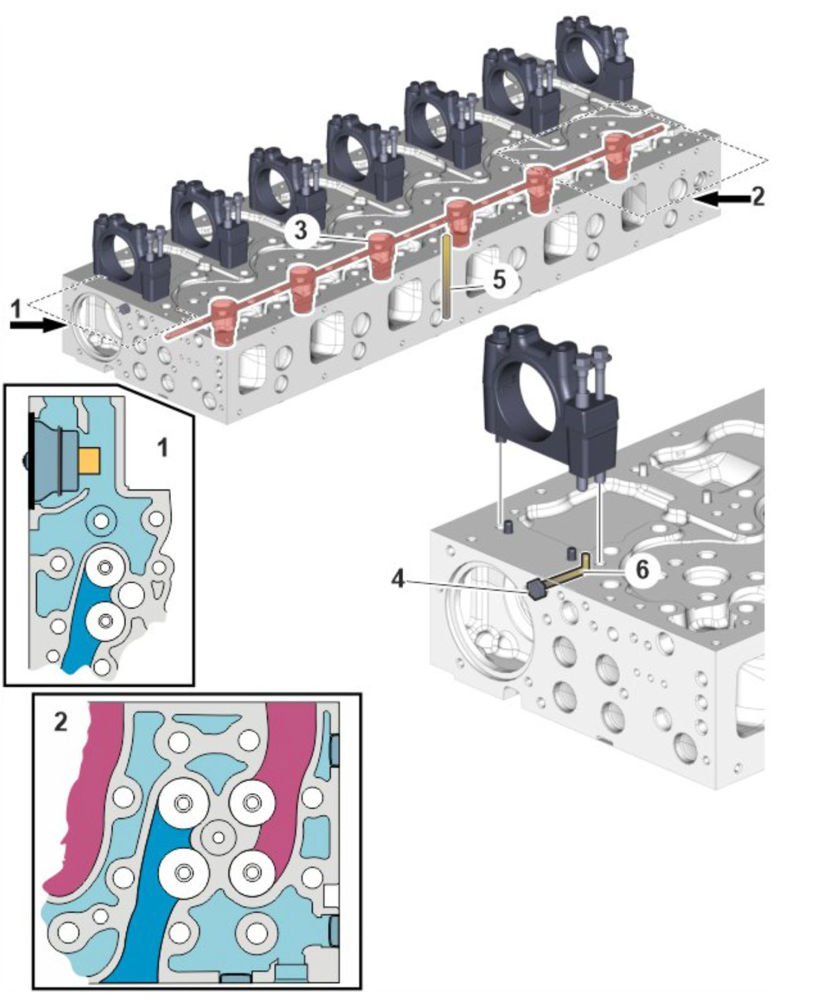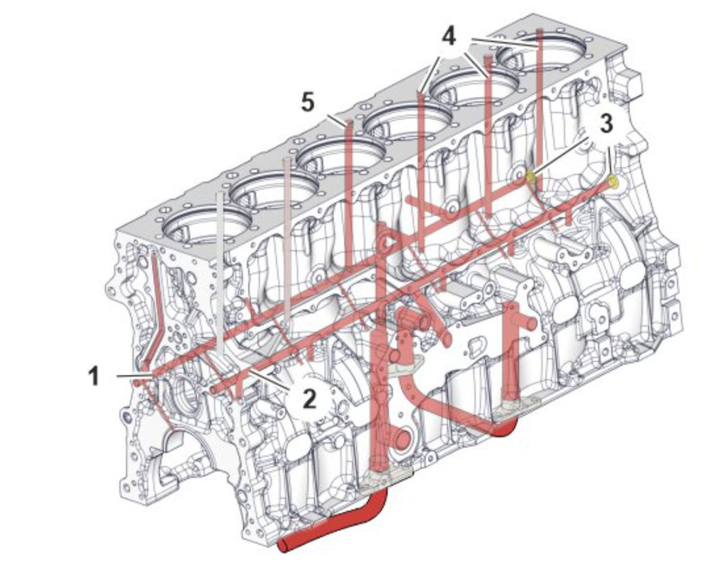 همچنین یک کانال مرکزی (5) بهصورت عمودی از میان بلوک و سرسیلندر عبور میکند تا روغن پرفشار را به سمت شیر ترمز موتوری ولوو (VCB Valve) یا محفظه اتصال منتقل کند.