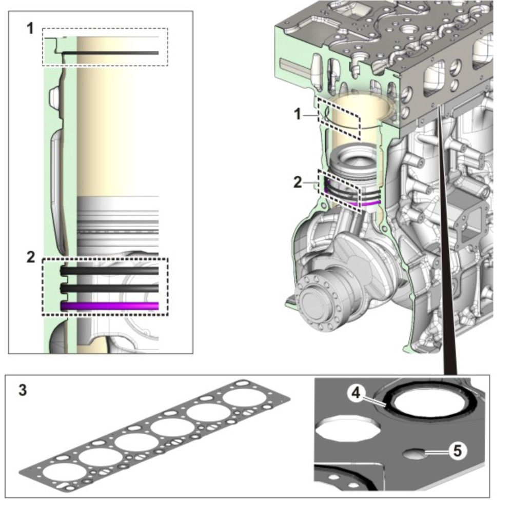 حلقه بالایی درست در زیر لبه نشیمن لاینر (1) قرار دارد. سطح تماس بالایی لاینر با واشر سرسیلندر بهصورت برجسته (Convex) طراحی شده است تا آببندی بهتری ایجاد کند. راهنمای لاینر روی بلوک سیلندر در قسمت بالای تکیهگاه لاینر قرار گرفته است.
